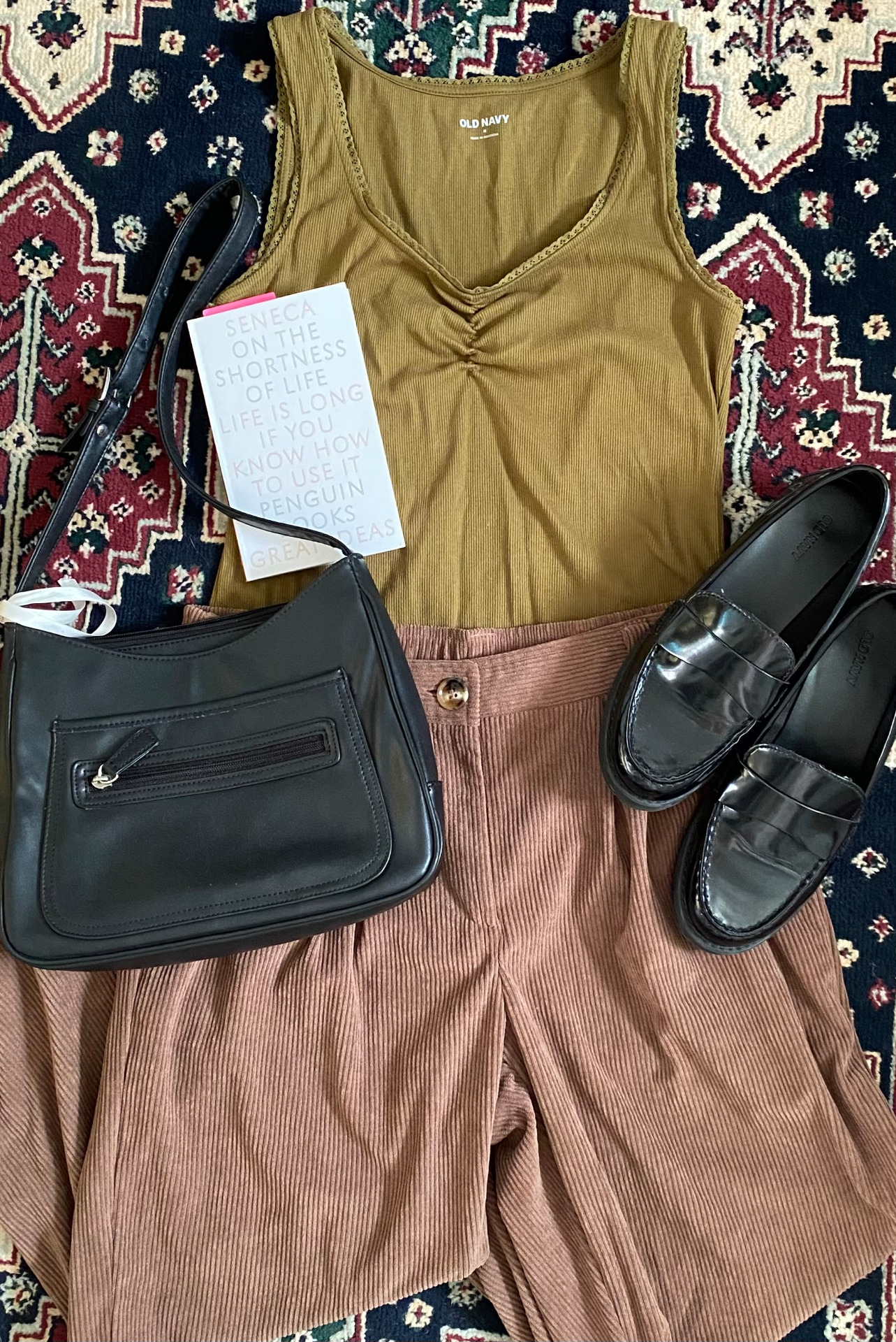 Brown loose slacks, black penny loafers, black purse with ribbon, olive green tank top and book: On the shortness of life by Seneca.