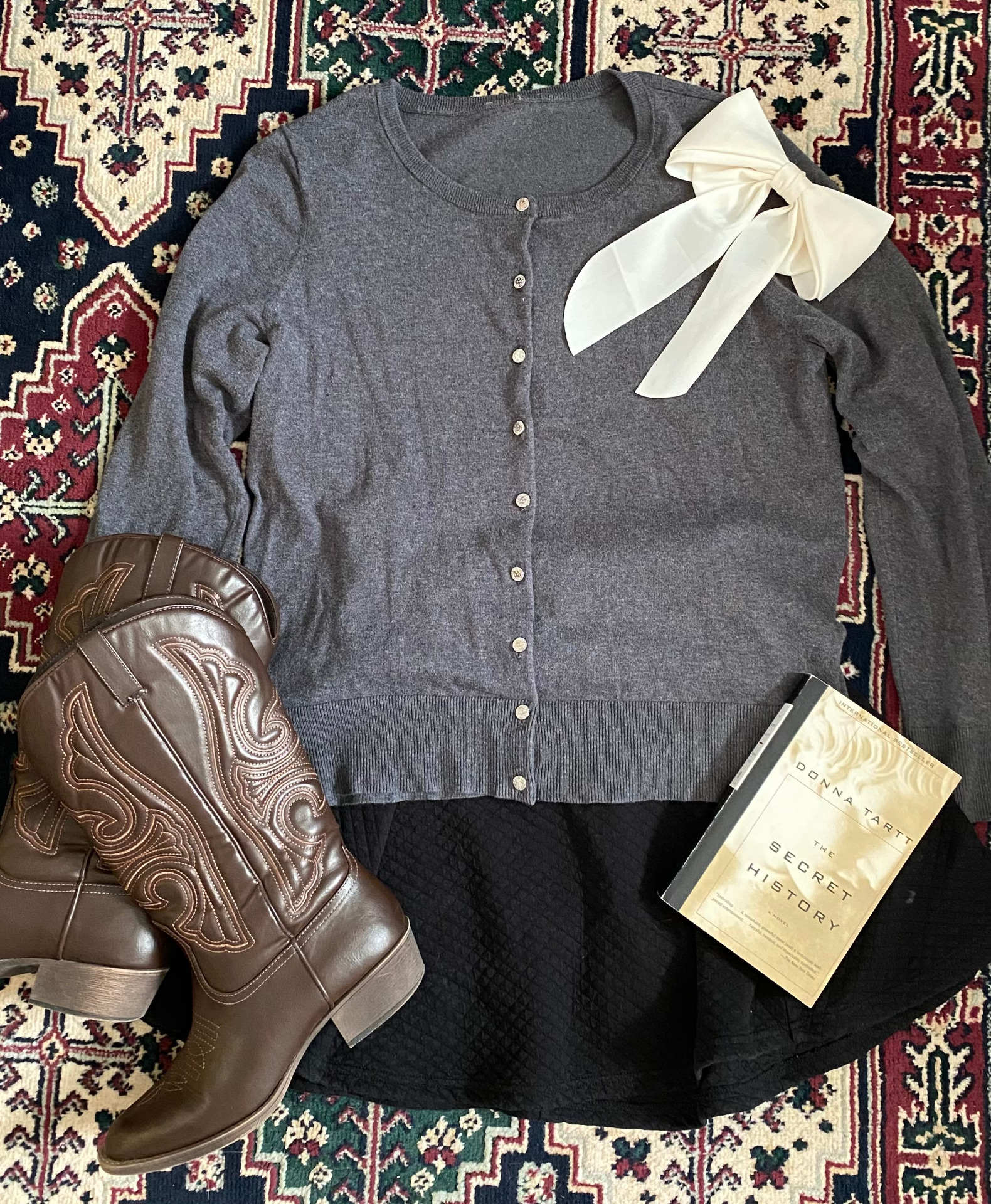Brown cowboy boots, white bow, black mini skirt, grey cardigan and book: The secret History by Donna Tartt.