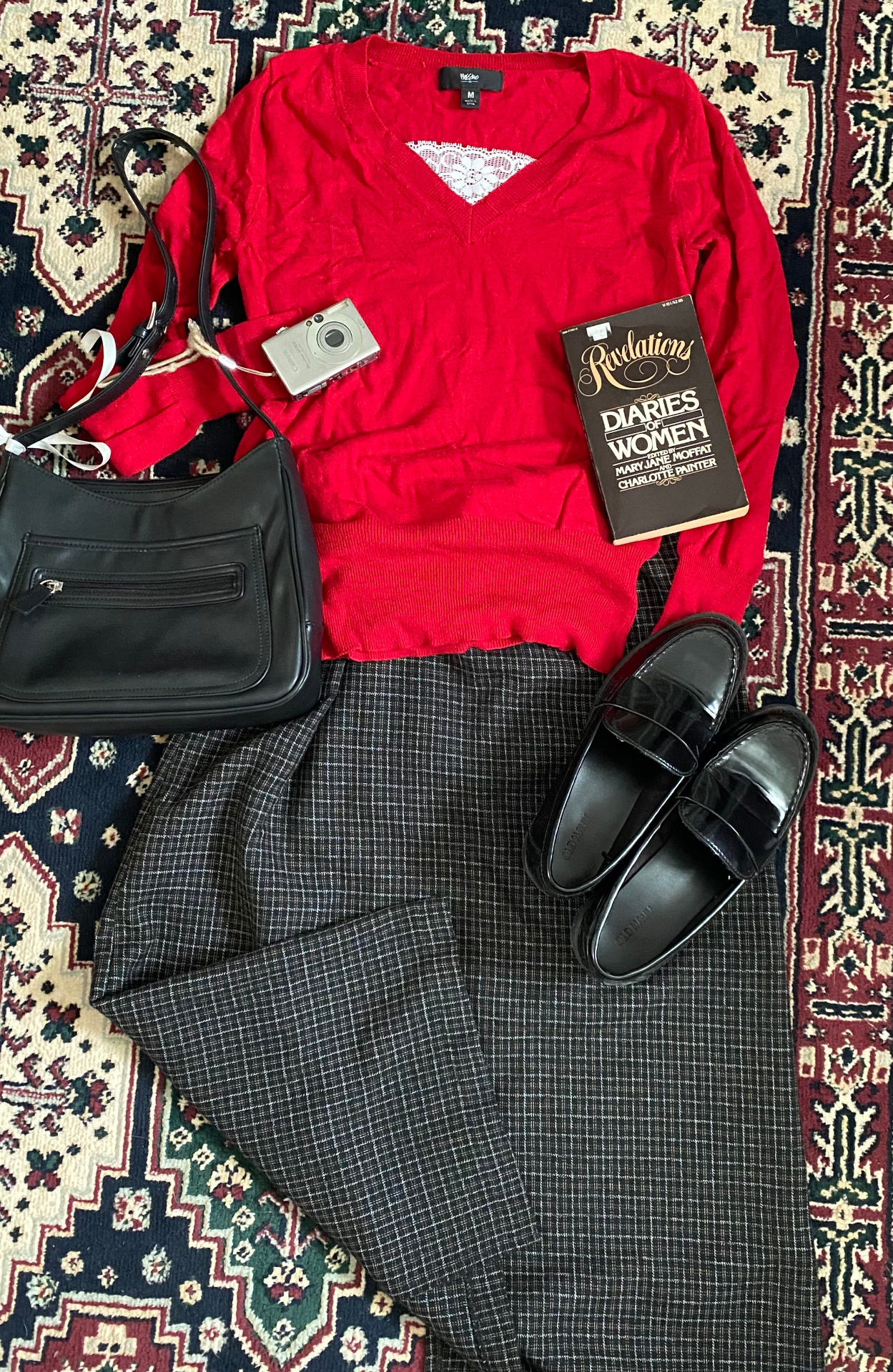 Grey wool maxi skirt, black penny loafers, black purse with ribbon, red long sleeve, digital camera and book: Diaries of Women.