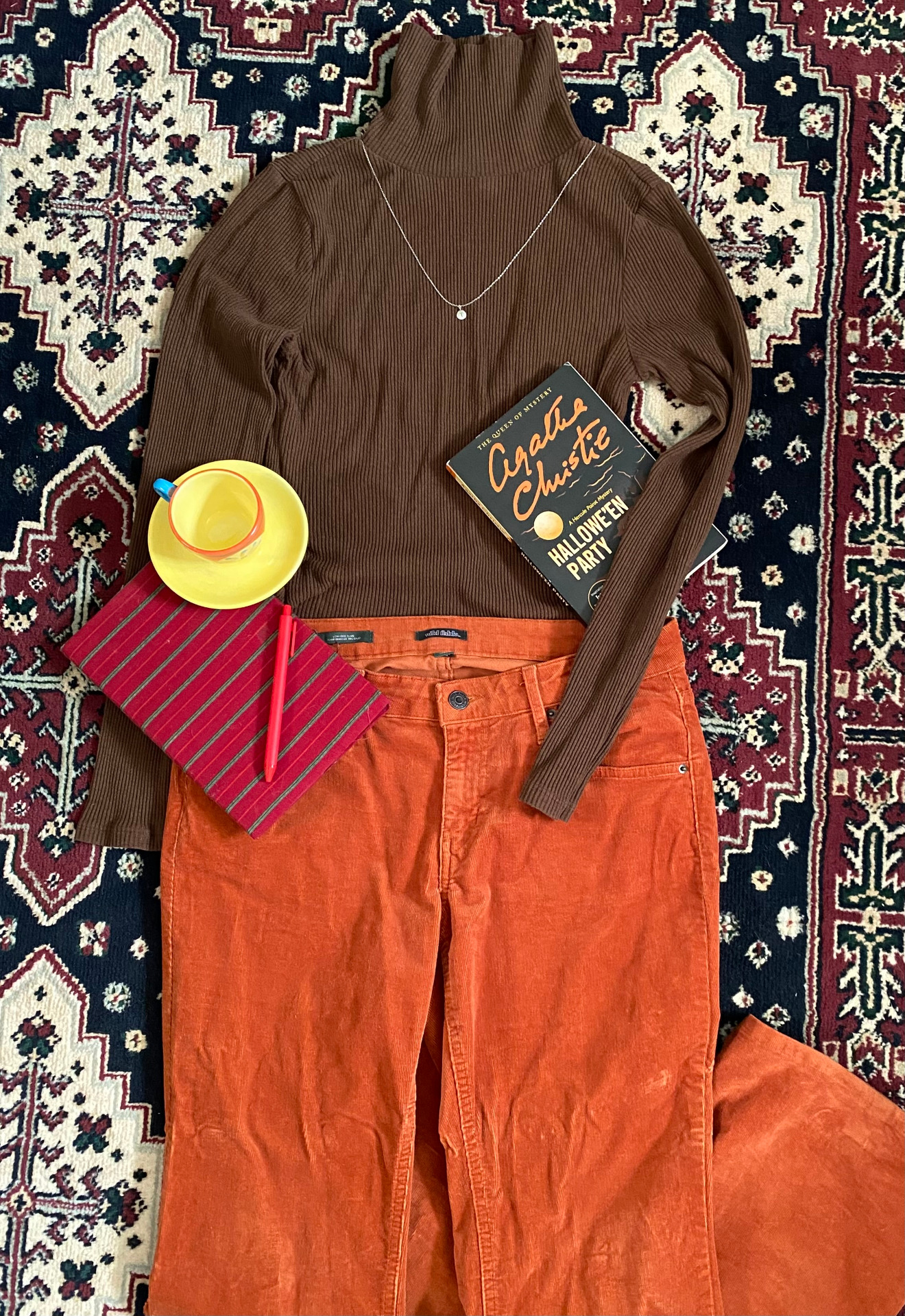 Orange corduroy pants, brown turtleneck, necklace with bf's initial, tea cup, red ink pen with journal for writing poetry and book: Hallowe'en party by Agatha Christie.