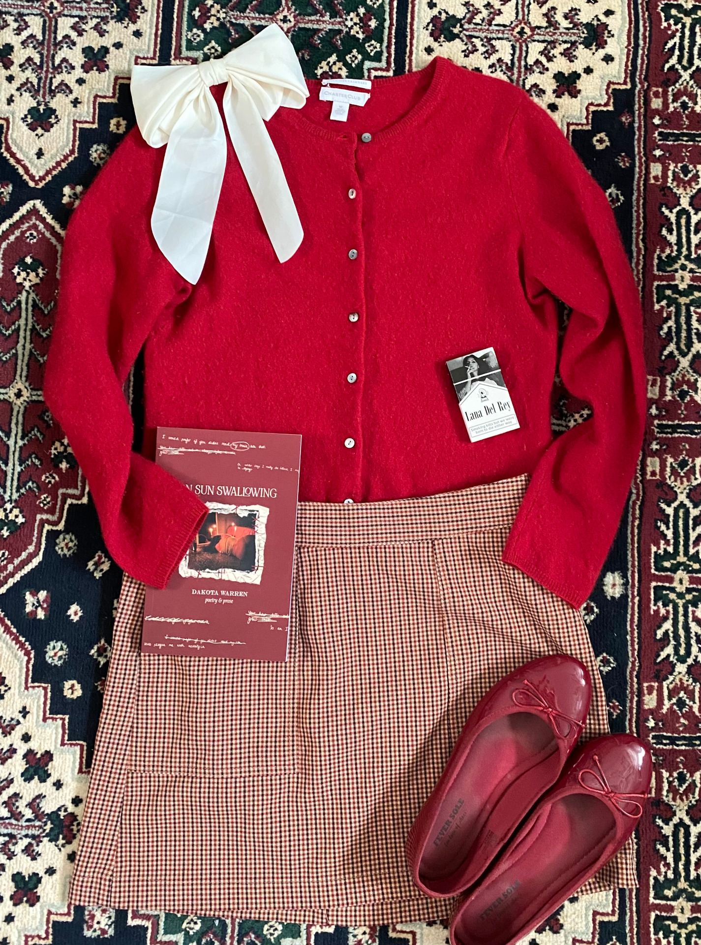 Plaid pencil skirt, red wool sweater, white bow, red ballet flats, Lana del rey cigarette lip sticks and book: On sun swallowing by Dakota warren.