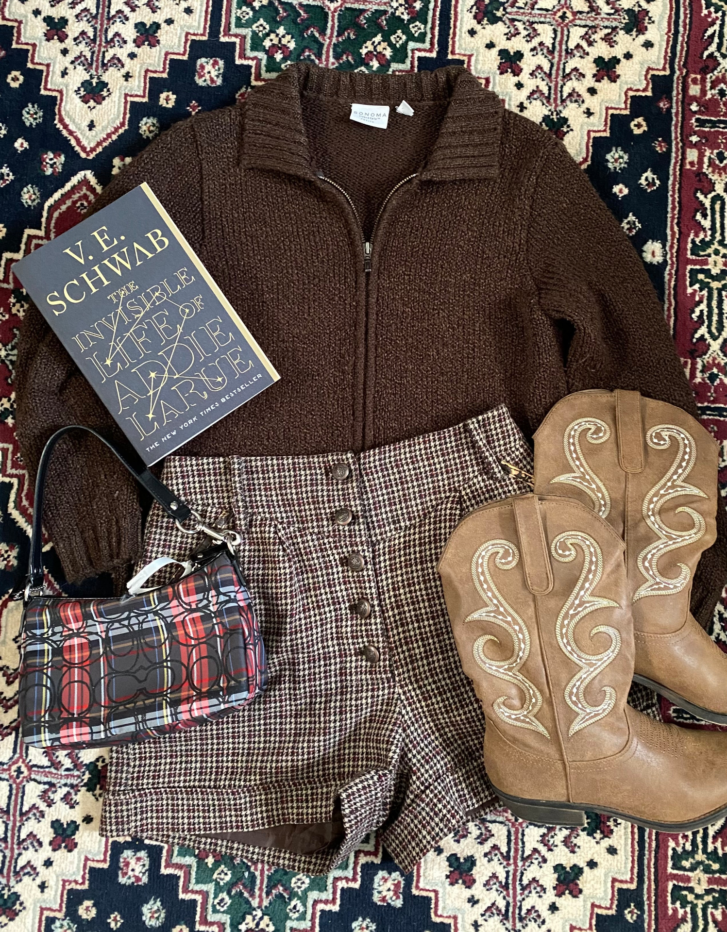 Brown zip up sweater, plaid high waisted shorts, tan cowboy boots, mini purse and book: the invisible Life of Addie Larue by V.E. Schwab.