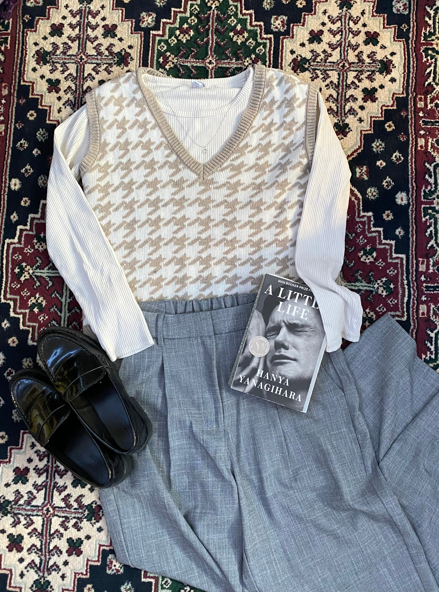 Grey slacks, white long sleeve, tan sweater vest, black penny loafers, necklace with bf's initial and book: a little life by Hanya Yanagihara.